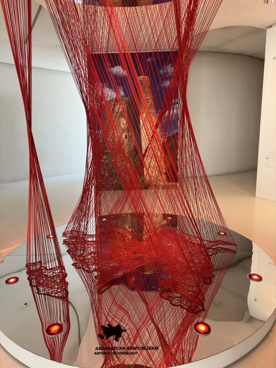 前面讲到了阿塞拜疆复杂的领土问题,所以自然阿塞拜疆人在这件事情上也非常敏感。在阿利耶夫文化中心,最让我印象深刻的是一系列用阿塞拜疆的传统工艺——毛毯和纺织——来表达阿塞拜疆完整国土的作品。
