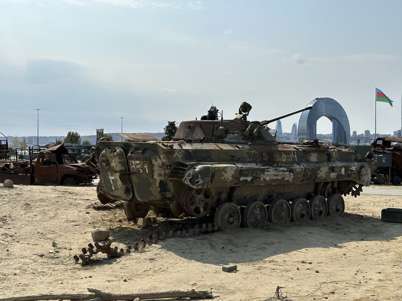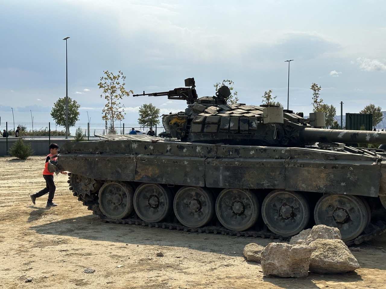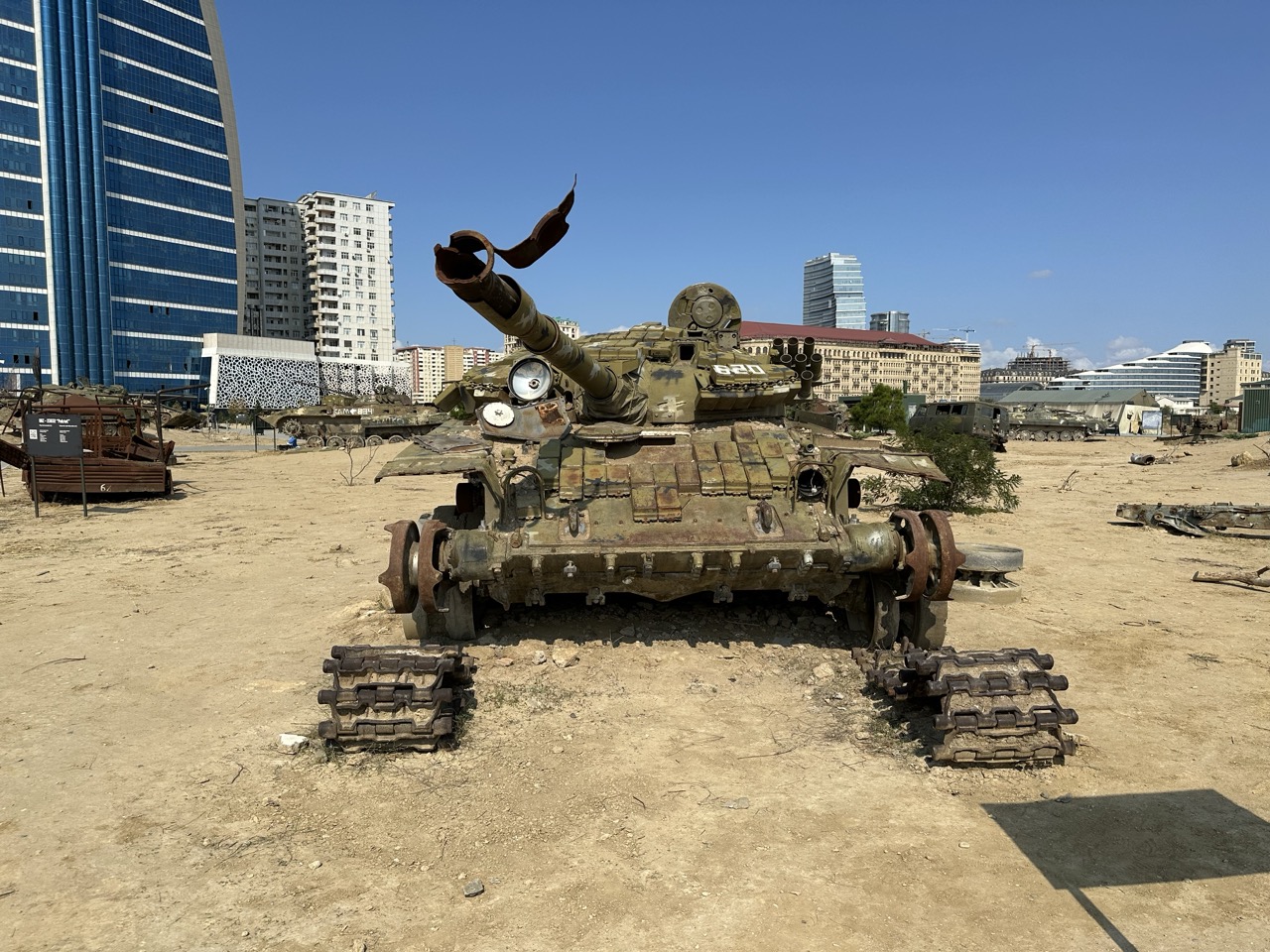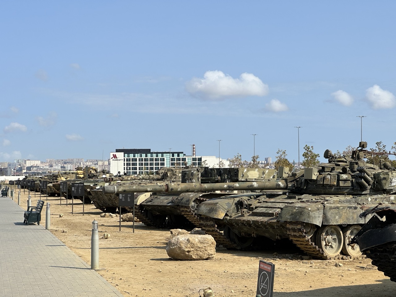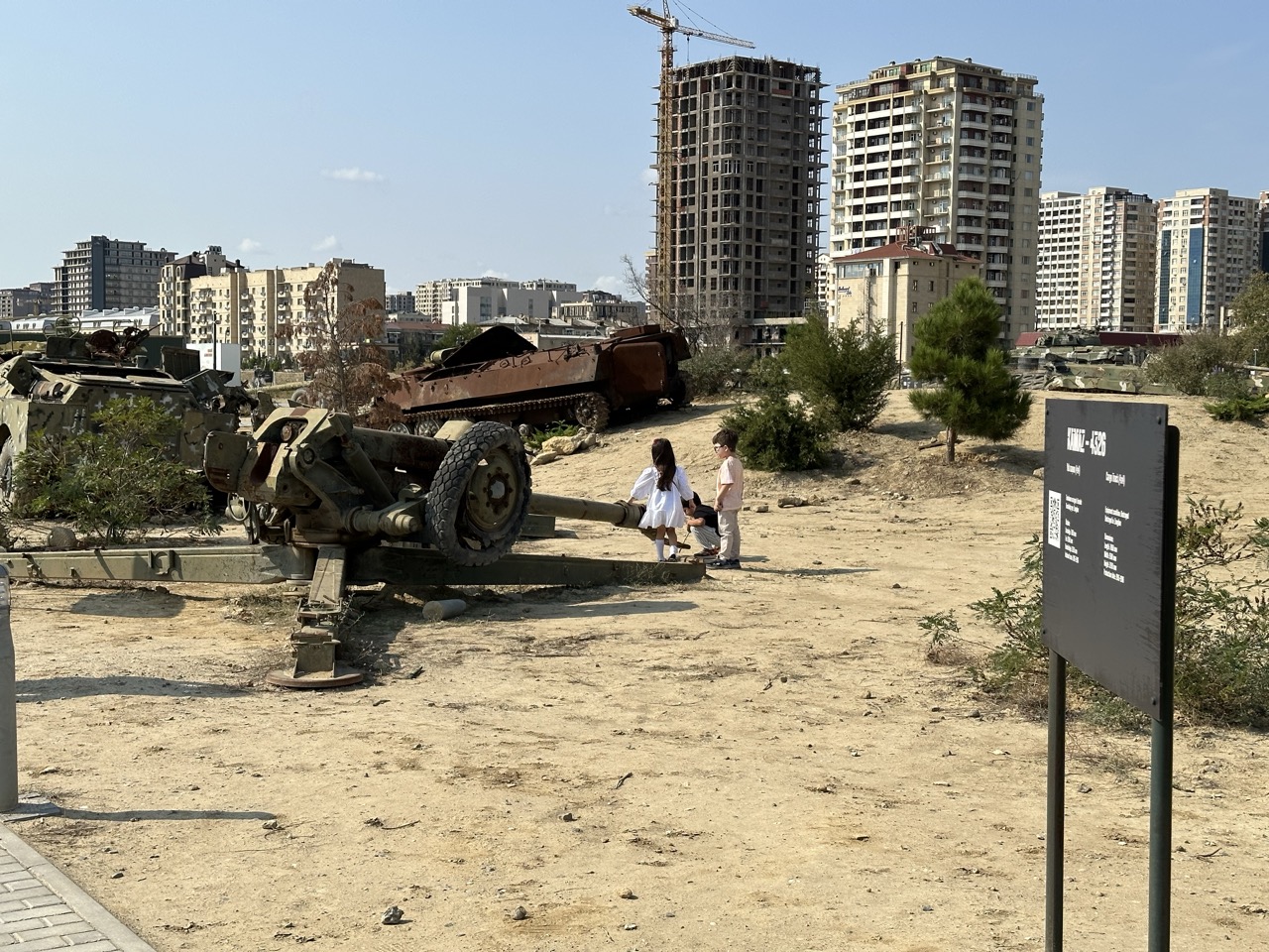 前面讲到在大部分历史时间里,阿塞拜疆一直是被亚美尼亚压着打,所以长期以来积累了无数的窝火,直到最近几年才胜仗频出,特别是一周多前彻底解决了纳卡问题,所以自然要向民众大肆宣扬战果。但我从来没有见过一个国家会对战争的宣扬像阿塞拜疆这么露骨,直接在市区腾出一大片空地,把真实的战场摆进市区,而且摆的还是亚美尼亚的军营,所有装备素材全部都是从亚美尼亚那里得到的战利品,从床铺,宣传海报到实实在在的坦克军车和飞机,直接 1:1 还原,甚至还建了大量战壕和铁丝网带。从博物馆角度来说,这是我去过的最真实的博物馆。从人性角度来说,看着那些小孩笑嘻嘻地在坦克上爬来爬去,心里很不是滋味。