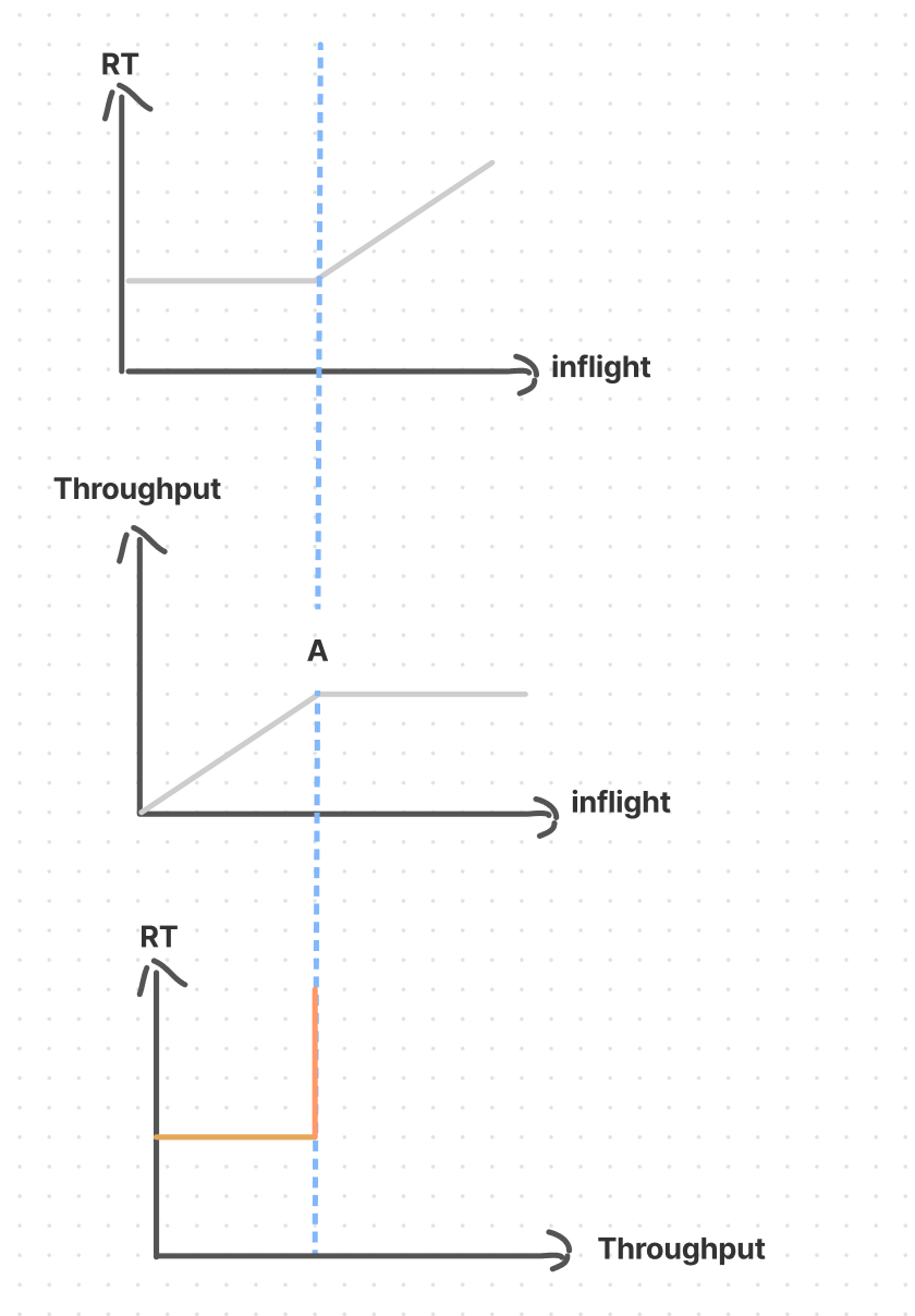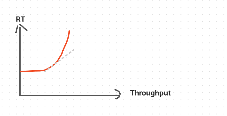 - 当 inflight 继续变大,出现了资源竞争时,RT 会随着 inflight 增大而增大,但 Throughput 并不会显著变化,因为有限的资源只能干有限的事情。