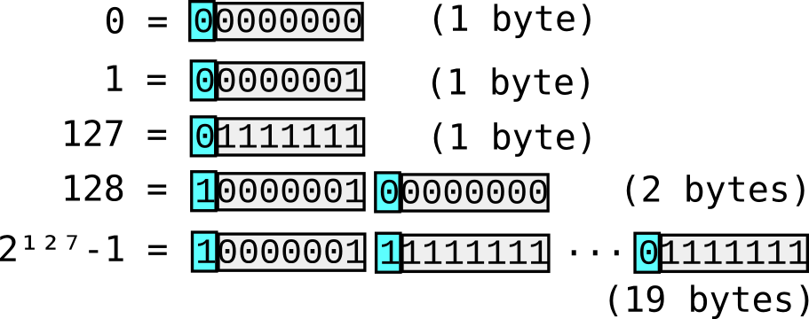 Varint 的思想很简单,每一个字节有 8 位,最高位表示下一个字节是否还是该数字的一部分,其余 7 位用原码补齐。例如: