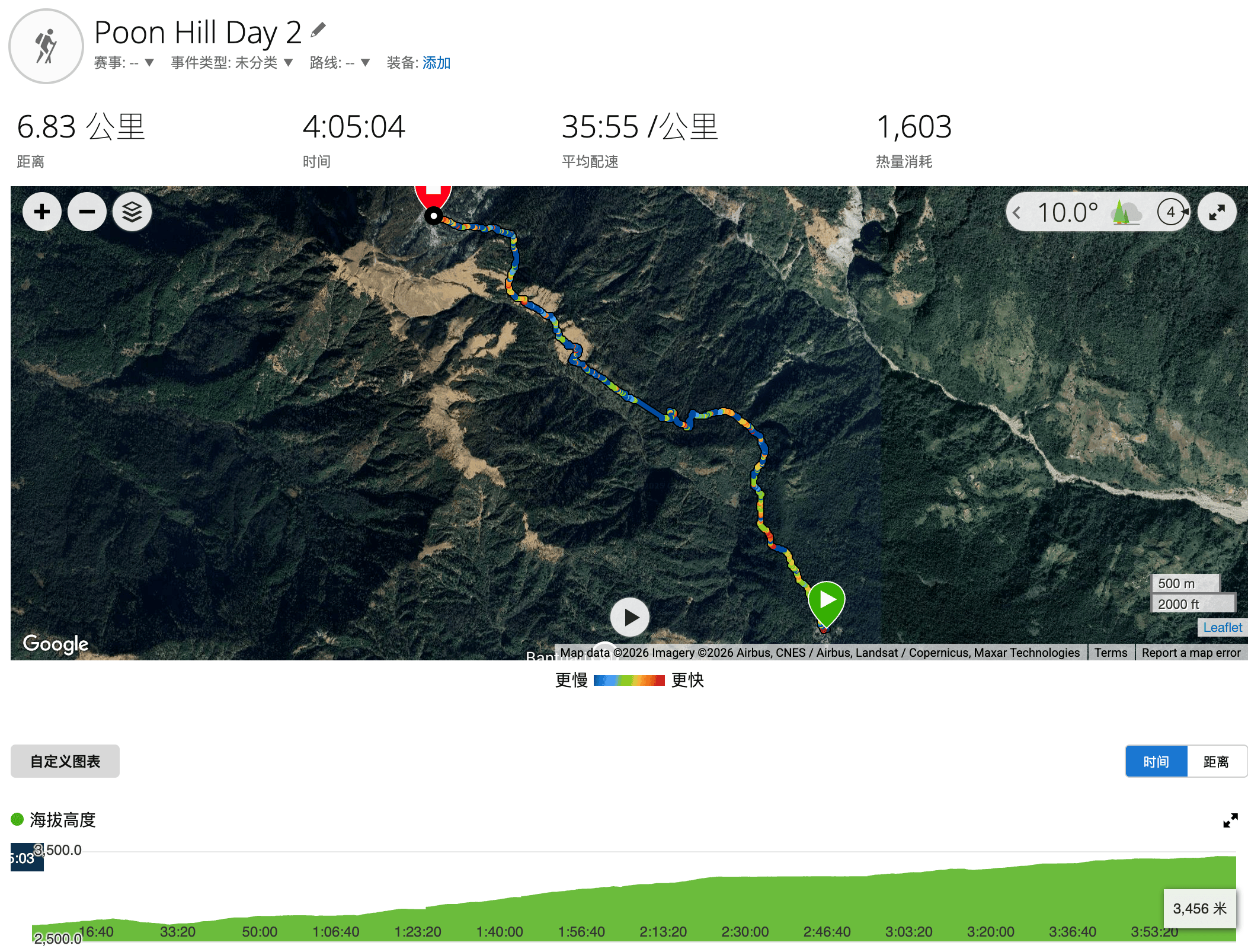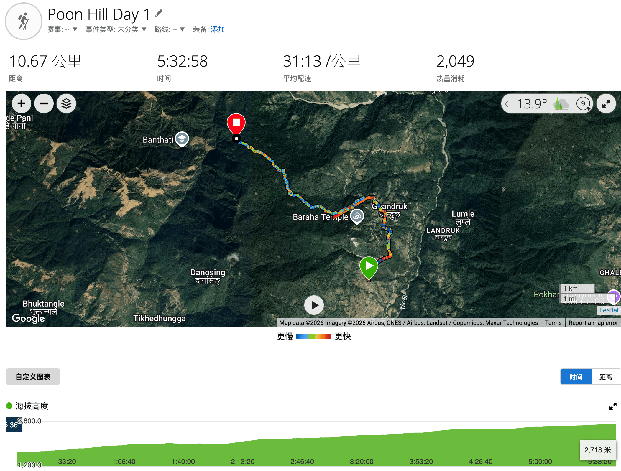第一天的路程主要以爬升为主。从 Ghandruk 到 Tadapani,累计爬升 1116 米,下降 112 米,住宿海拔 2718 米。
