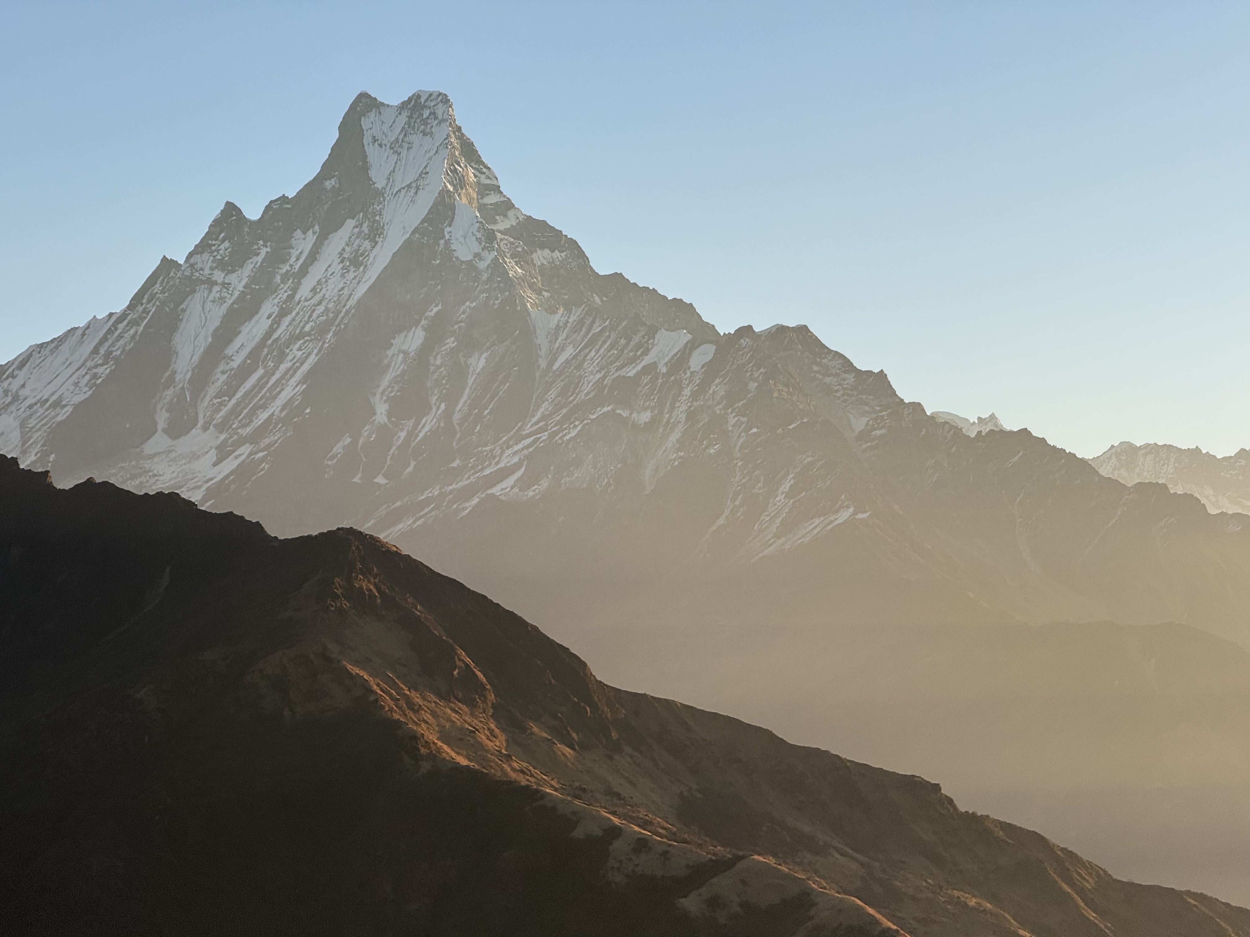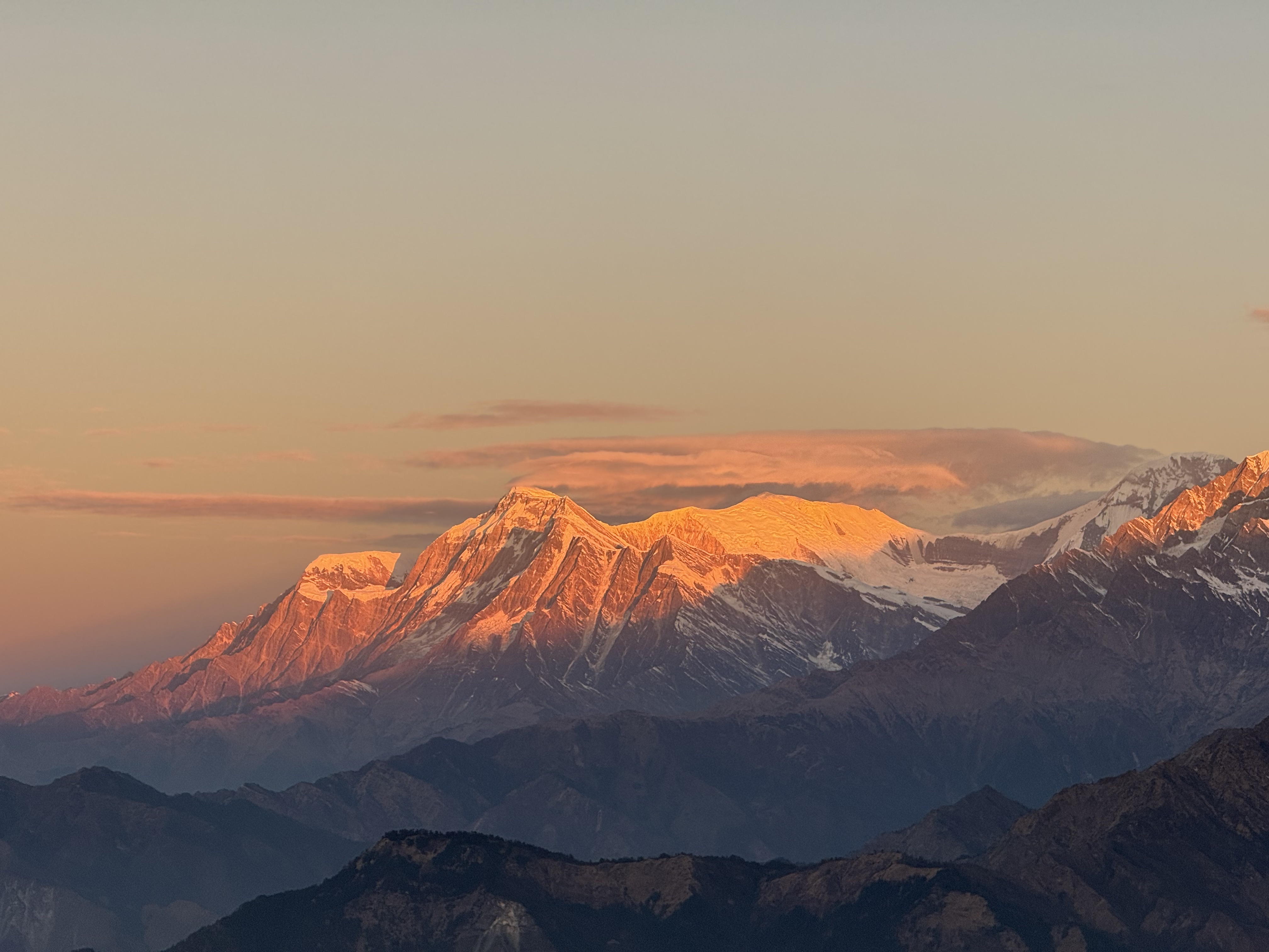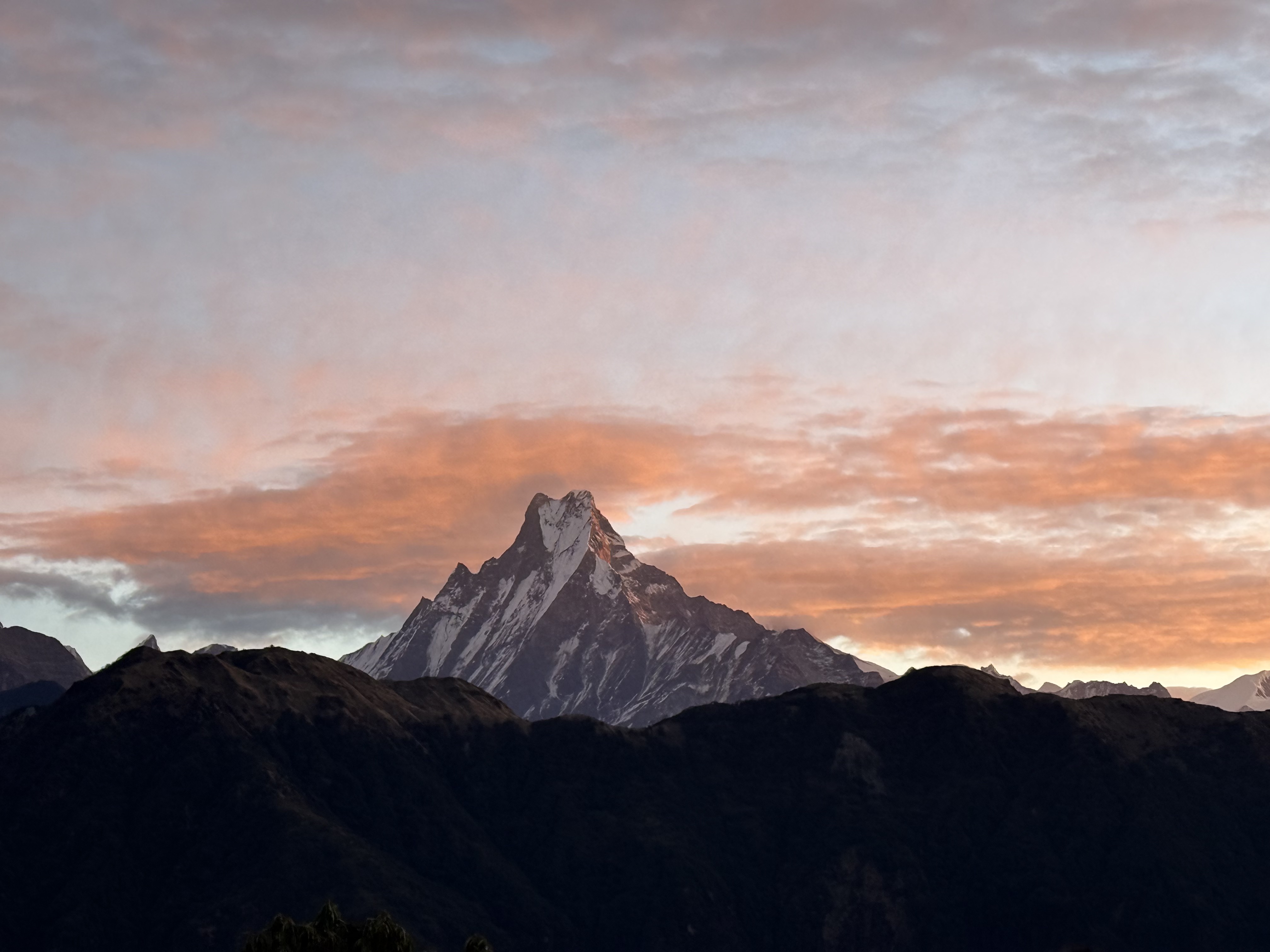早上起来,我们就在 Tadapani 看到了壮丽的安纳普尔纳南峰和鱼尾峰的日照金山: