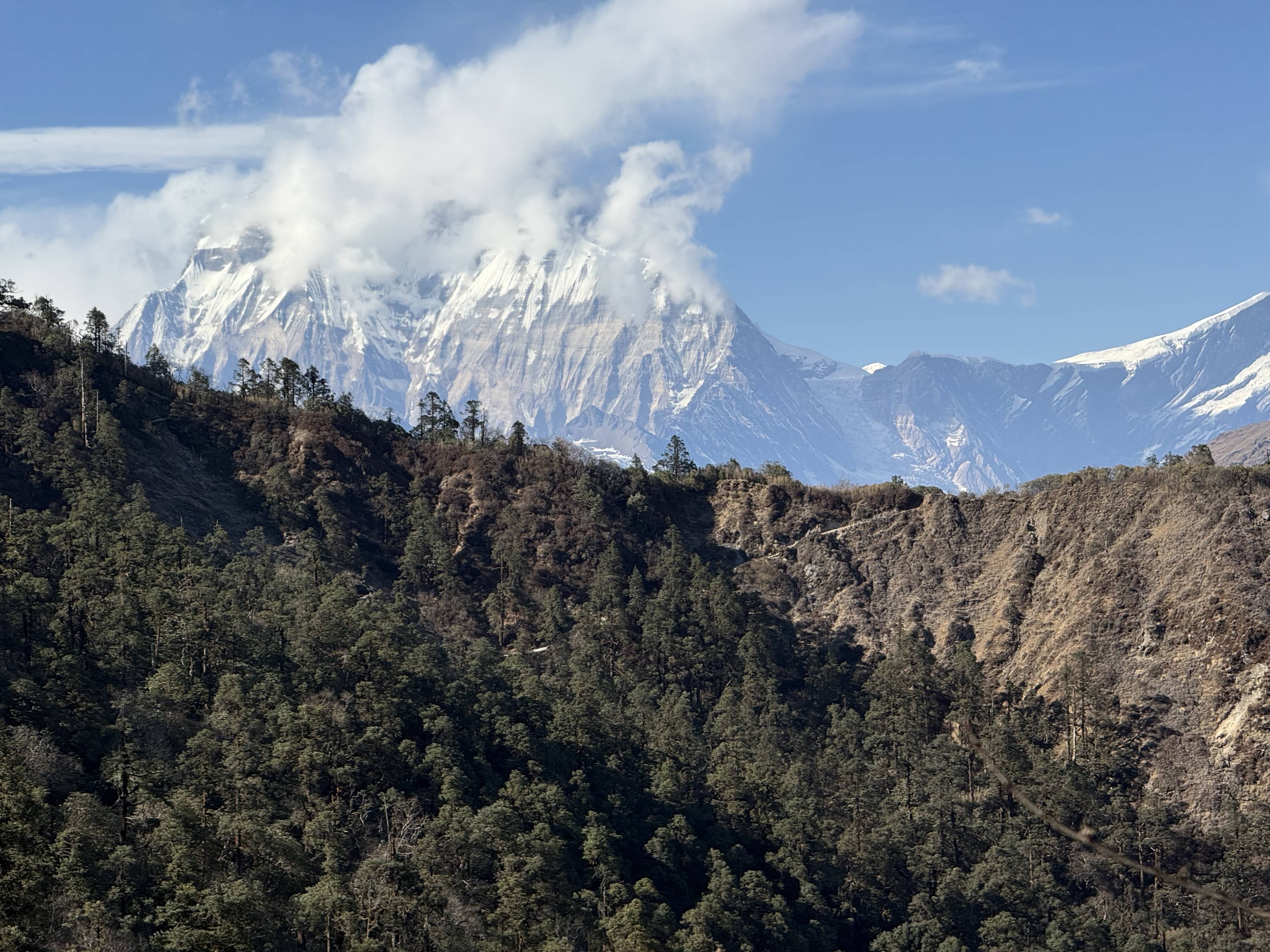 这一天的路上我们还时不时能从林子缝隙里从不同角度看到这两座山峰的容貌,在路程末尾还看到了道拉吉里峰和Tukuche peak。